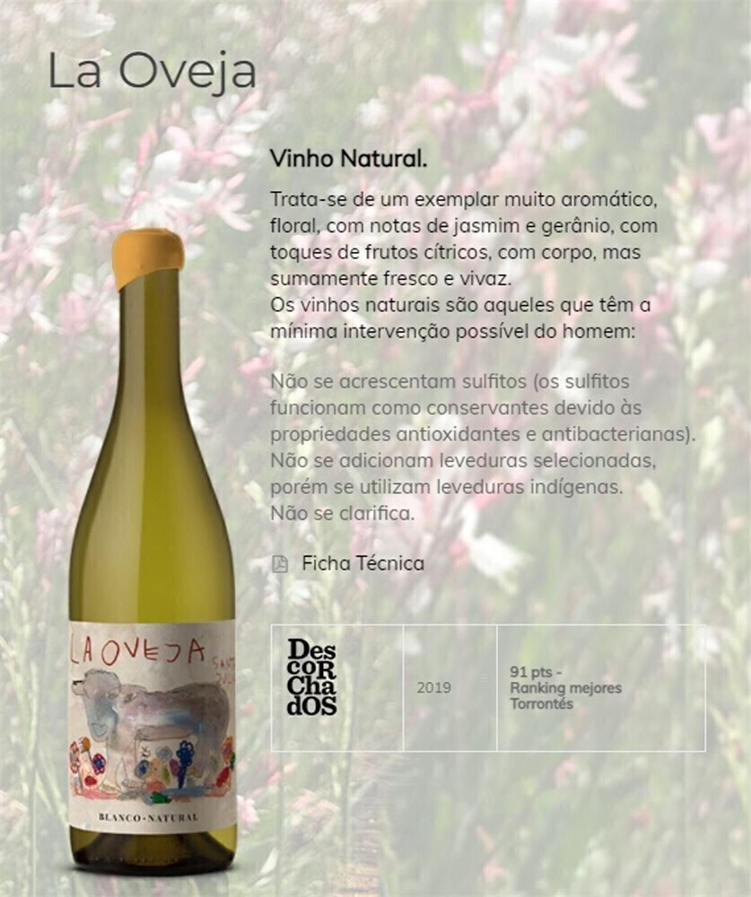 O Vinho La Oveja Torrontés Natural apresenta coloração amarelo de intensidade média e reflexos esverdeados, mostra aromas frutas brancas como pêssegos e notas florais além de aromas cítricos de casca de limão.